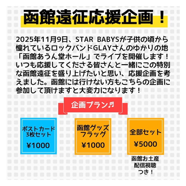 函館遠征応援企画!全部セット ¥5,000 内容:ポストカードセット・函館グッズ旗・函館お土産・ライブ配信視聴 *函館で撮影したポストカードセット、函館お土産は遠征終了後にお届けします。 *函館グッズ旗は10/18〜順次発送予定。 *ライブ配信視聴のご招待コードを、BASEにご登録のメールアドレスに11/2までにお送りします。 2025年11月9日、STAR BABYSが子供の頃から 憧れているロックバンドGLAYさんのゆかりの地 「函館あうん堂ホール」でライブを開催します! いつも応援してくださる皆さんと一緒にこの特別 な函館遠征を盛り上げたいと思い、応援企画を考 えました。函館には行けない方もこちらの企画に 参加して頂けますと大変力になります!