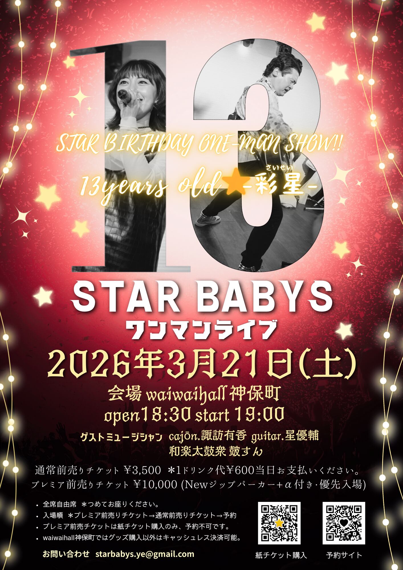 2026年3月21日waiwaihall神保町のSTAR BABYSワンマンライブのチケットです。こちらでの販売は2026年3月16日(月)まで。